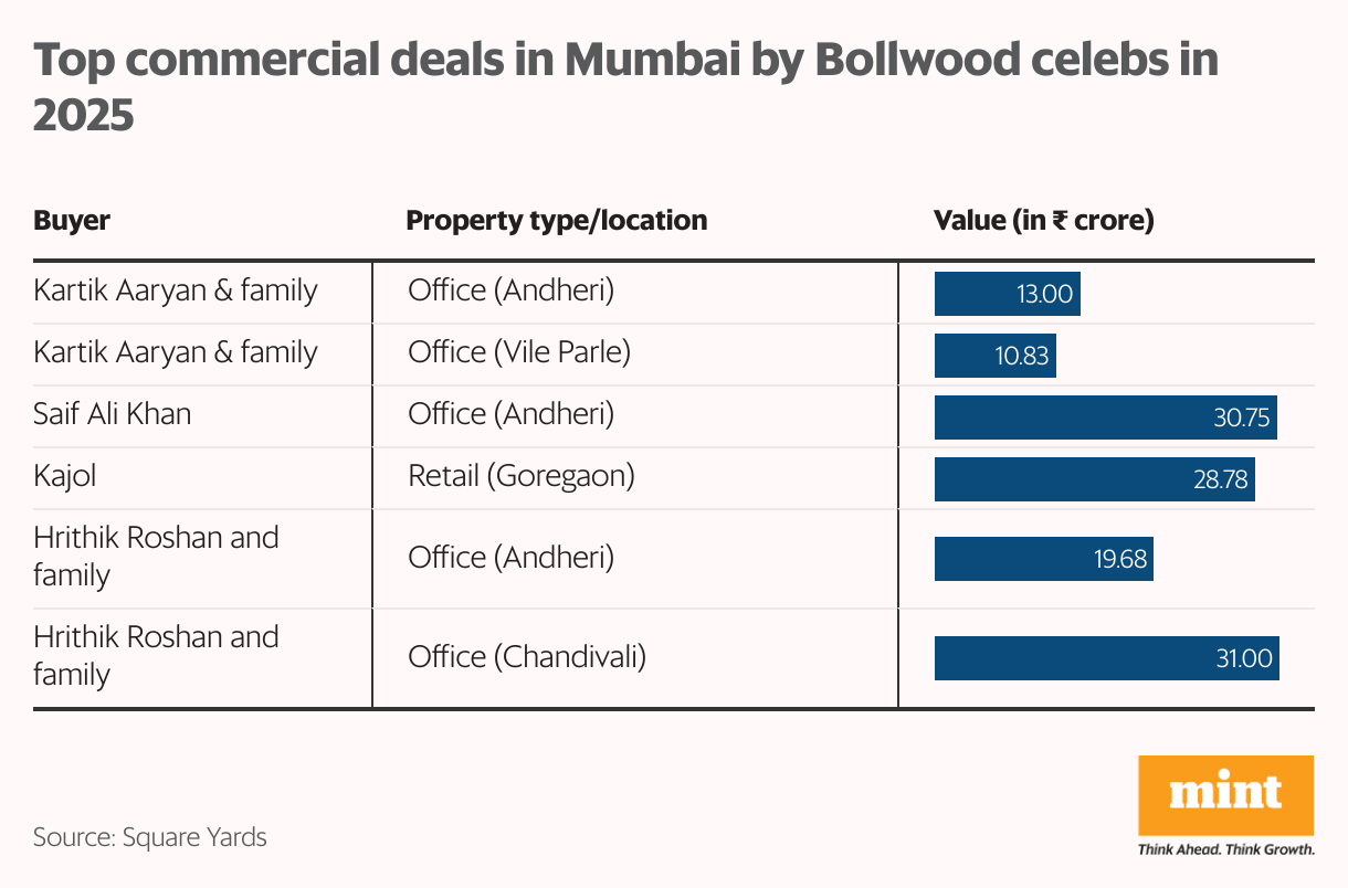 Between 2024 and 2025, nearly 60 commercial property transactions, including outright purchases and leases, by Bollywood personalities have been registered, according to registration and stamp duty data compiled by online real estate marketplace Square Yards and shared with Mint.