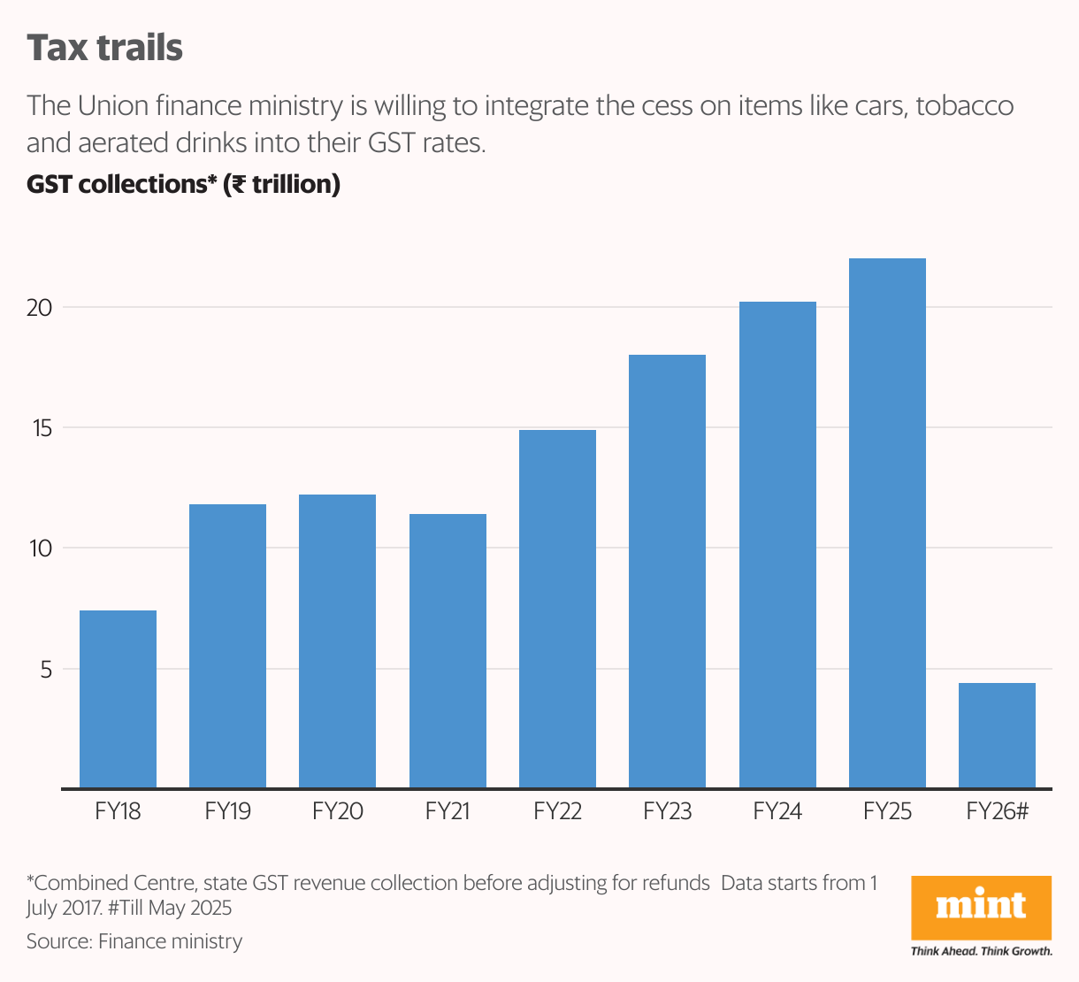 According to two people familiar with discussions in the GST Council, the Union finance ministry is willing to integrate the cess on items like cars, tobacco and aerated drinks into their GST rates. The cess, levied on top of the GST rate, was originally intended to compensate states for potential revenue loss due to the transition to GST. In 2022, it was extended till March 2026 to repay central loans taken to support states during the pandemic.
