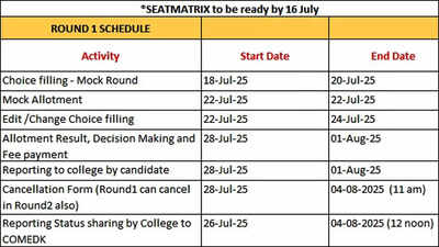 Mock round to help candidates understand seat preferencesThe mock allotment is aimed at giving candidates a preliminary idea of the seat they may be allotted based on their current preferences and rankings. This enables applicants to revise or rearrange their choices before the final allotment. The mock round result will be released on July 22, 2025, followed by an edit window open until July 24, 2025.Final allotment and reporting processThe final seat allotment results will be released on July 28, 2025. Candidates allotted seats must make their decisions and pay the prescribed fee by August 1, 2025. The same dates apply for physical reporting to the respective colleges. In case of withdrawal or cancellation, candidates from Round 1 can submit a cancellation form by August 4, 2025, until 11 AM.Colleges are required to submit the reporting status of candidates to COMEDK from July 26, 2025, to August 4, 2025, by 12 Noon.