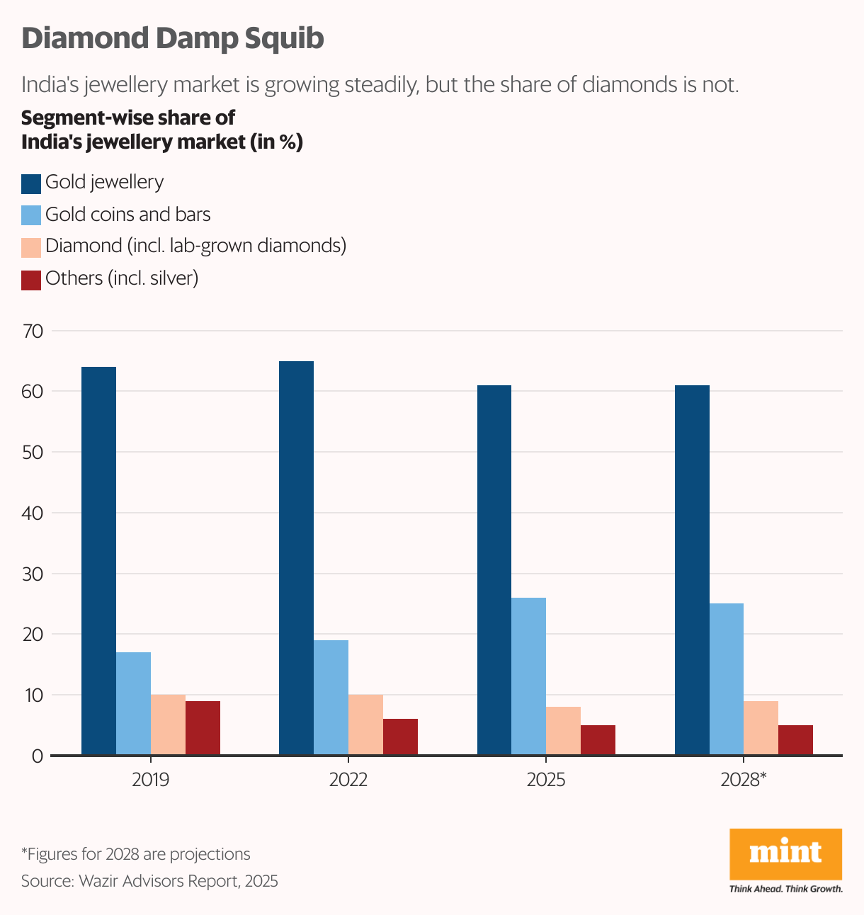 To be sure, India’s natural diamond market, worth an estimated $6.2 billion in FY25 according to consulting firm Wazir Advisors, is much larger than its lab-grown counterpart, which has a very modest size of $0.4 billion. Both segments are expected to grow.