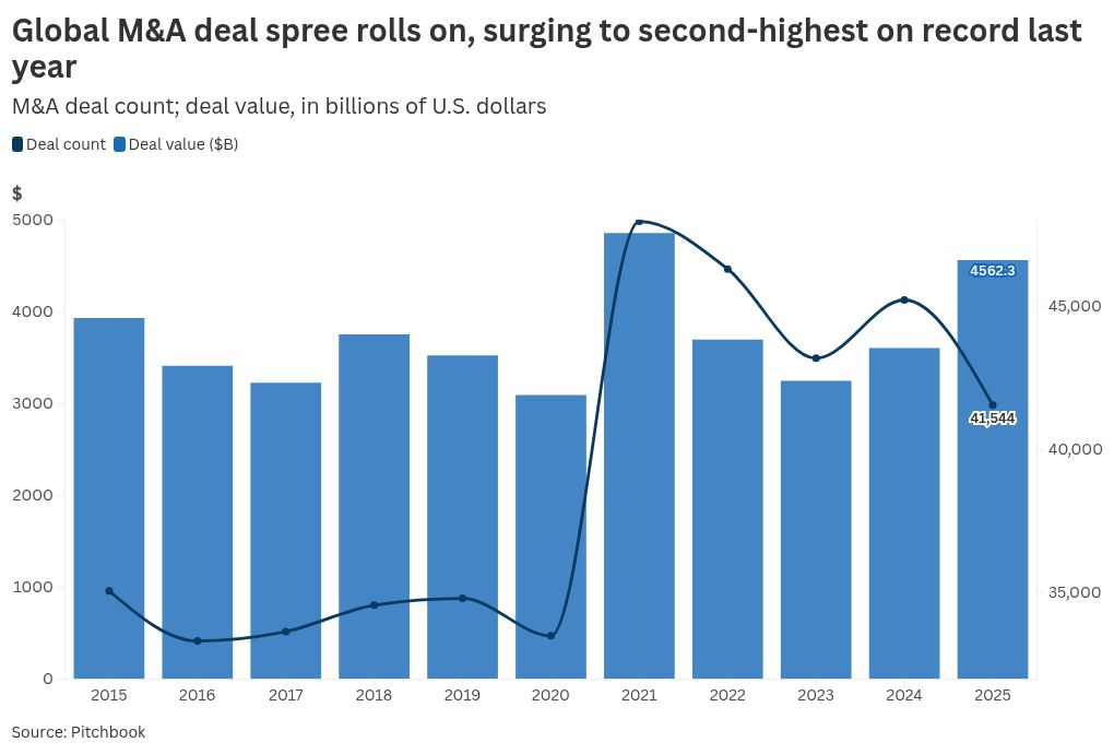 That marked the second-highest level on record, trailing only the $5.6 trillion peak in 2021, when low borrowing costs and buoyant equity markets propelled a historic dealmaking frenzy.