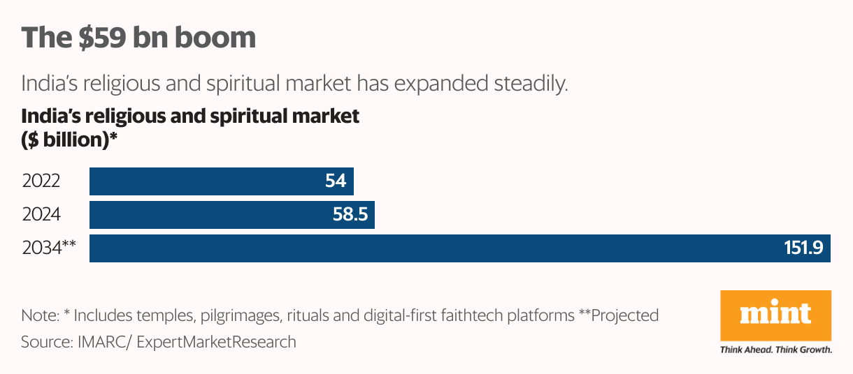 India’s religious and spiritual market, which includes temples, pilgrimages, rituals and now a growing wave of digital-first faithtech platforms, has expanded steadily from an estimated $54 billion in 2022 to about $58.5 billion in 2024 and is projected to reach US $151.9 billion by 2034, according to Claight Corporation.