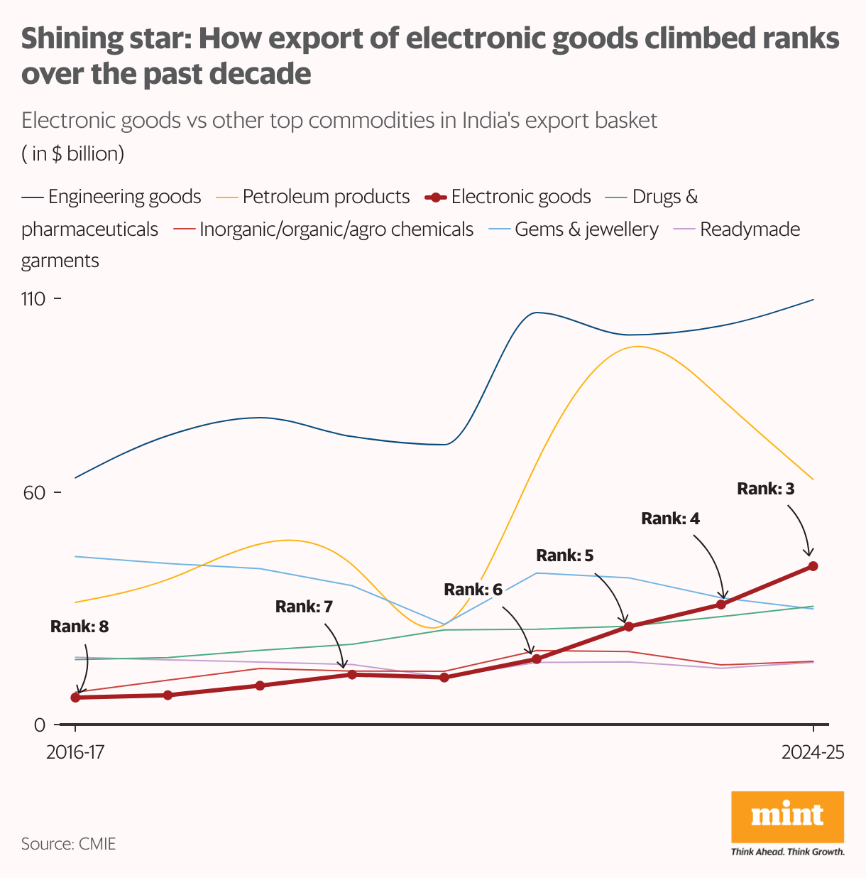 India’s electronics exports are having their moment. It emerged as the third-largest export category in 2024-25 and continued this streak in 2025-26, a Mint analysis of commerce ministry data showed.