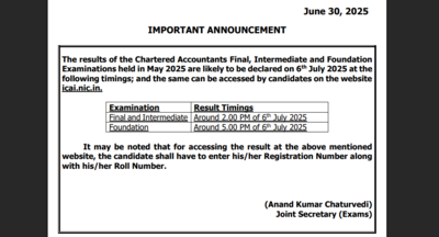 “The results of the Chartered Accountants Final, Intermediate and Foundation Examinations held in May 2025 are likely to be declared on 6th July 2025 at the following timings; and the same can be accessed by candidates on the website icai.nic.in,” the institute stated in its official release.