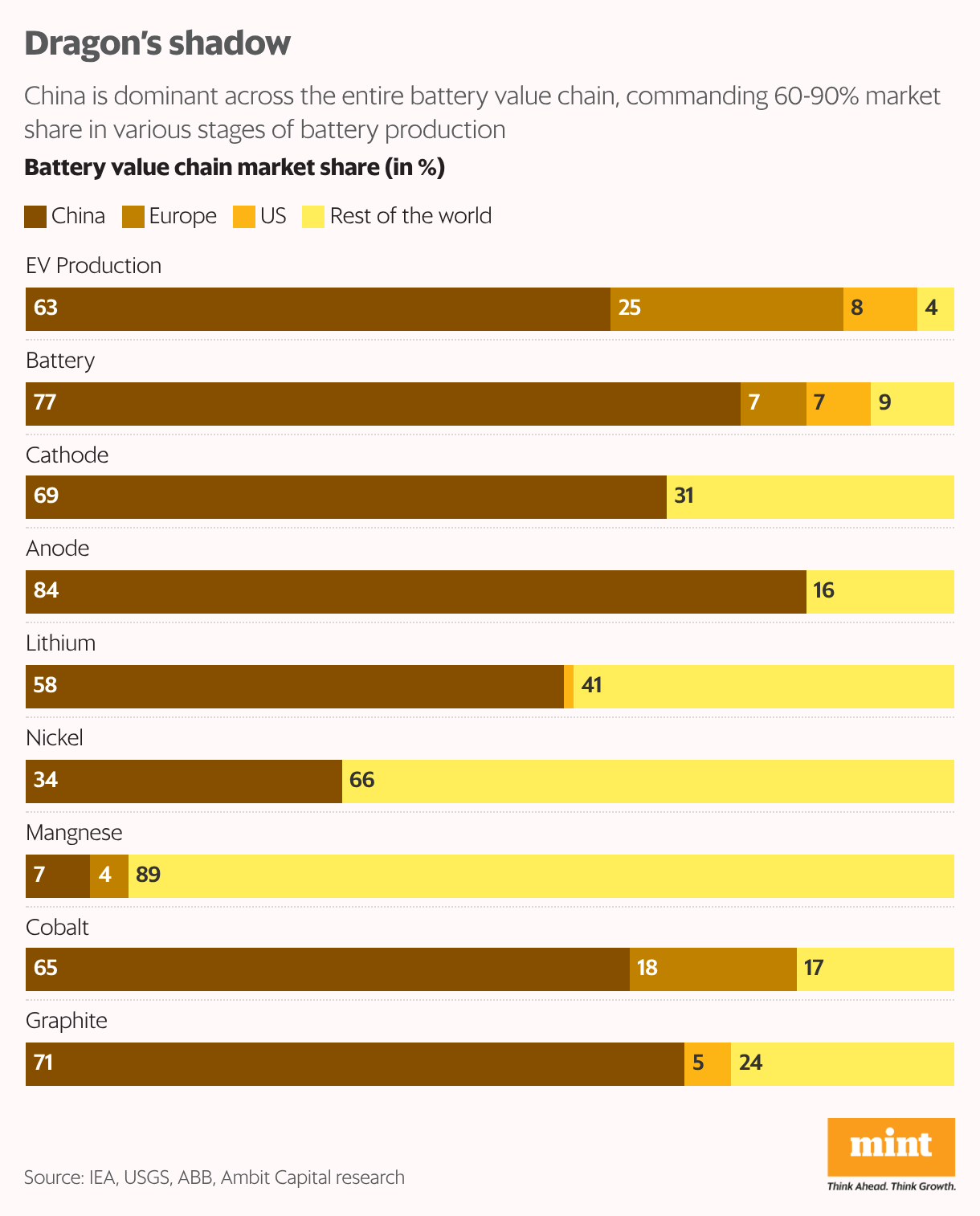 But the challenge in replication is scale and economics. China has a major role at each stage of the global battery supply chain and dominates the interregional trade of minerals. According to Jefferies, China currently controls about 70% of global lithium processing, 95% of graphite processing and nearly 70% of synthetic graphite capacity. It also dominates battery components, accounting for over 90% of global cathode and anode manufacturing. Also, Chinese cell makers are pricing products close to raw-material and energy costs, supported by low financing costs and effectively squeezing margins for new entrants elsewhere.
