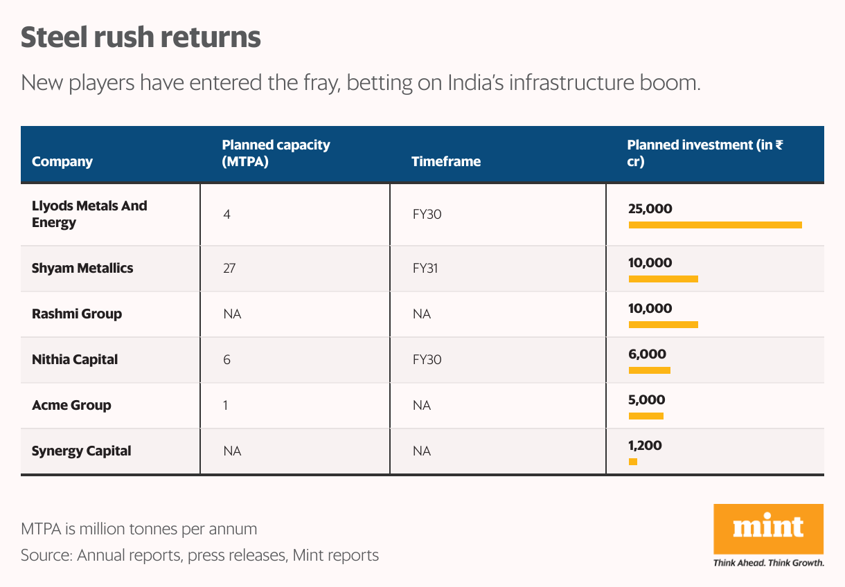 In this context, the new entrants are making a bold bet given the unforgiving nature of the sector. After all, the landscape is dotted with the ruins of once-thriving industrial giants that went under, warning them of the dangers. Nevertheless, the promise of a growing India and its growing appetite for steel is too lucrative a bet to ignore.