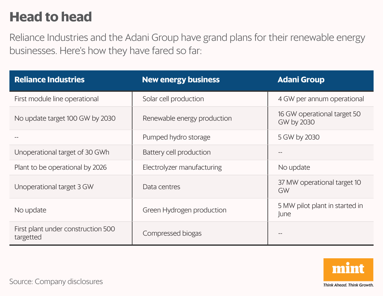 While both conglomerates have grand plans, Adani had a headstart in the new energy ecosystem, having entered the space a decade ago in 2015 when it set up Adani Green Energy.