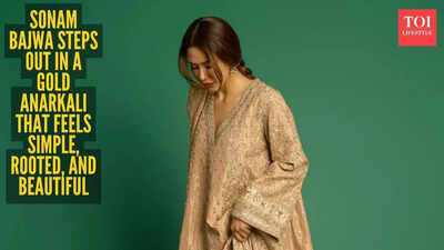 The purple potli is a sweet little surprise. Just a pop of colour to break the gold, without stealing attention from the suit. Small detail, but it adds personality. Her makeup and hair stick to the same relaxed vibe. Fresh skin, soft makeup, nothing heavy or sharp. Hair pulled back casually, with a few loose strands around the face. It feels natural, like she didn’t try too hard, and that’s what makes it work. What really stands out, though, is how comfortable she looks. Calm, confident, and completely at ease. That’s Sonam Bajwa’s thing. She doesn’t wear suits like they’re outfits. She wears them like they’re part of her. And this gold-toned anarkali feels exactly like that. Simple, rooted, and quietly lovely.