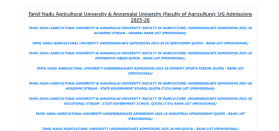 TNAU UG rank list 2025 released: The Tamil Nadu Agricultural University (TNAU) and the Faculty of Agriculture at Annamalai University have officially published the rank lists for Undergraduate (UG) admissions 2025. Aspirants can now access the lists on the official TNAU admission portal — tnau.ac.in/ugadmission — without the need for login credentials.The rank lists have been issued category-wise, covering general, government school quota, sports quota, and other reservation categories. The files have been released in PDF format, enabling candidates to directly download and verify their selection status using their application ID or name.This marks a crucial step in the UG admission cycle for agricultural sciences aspirants across Tamil Nadu. Both TNAU and Annamalai University are witnessing heightened competition this year, owing to the increasing popularity of agricultural studies aligned with sustainability goals and rural entrepreneurship.