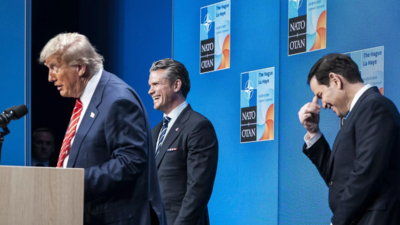Pete Hegseth, center, and Marco Rubio, right, laugh as a reporter asked if Nato secretary general Mark Rutte called US President Donald Trump “daddy” during a news conference at the 2025 Nato Summit in The Hague, Netherlands. (NYT News Service)