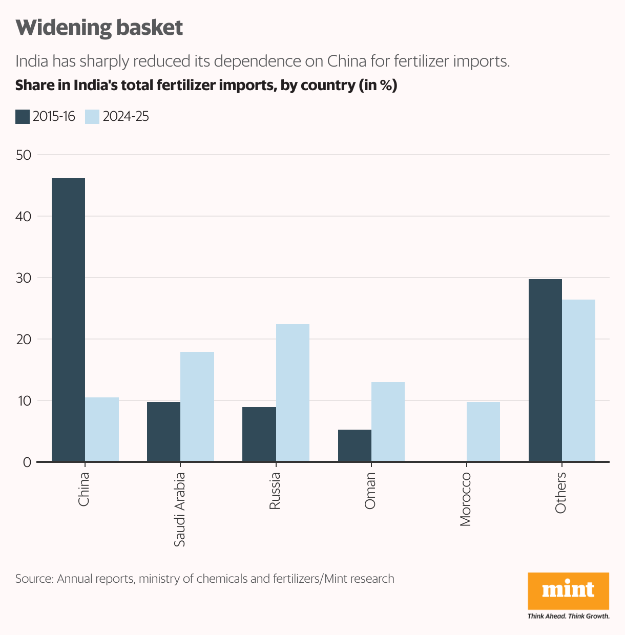 India has been diversifying its fertilizer imports to shield itself from geopolitical shocks. It has sealed long-term supply deals for both fertilizers and their raw material. Last week, three Indian companies—Indian Potash Ltd, Kribhco and Coromandel International Ltd—signed a five-year agreement with Ma’aden, Saudi Arabia’s state-owned mining and mineral major, for supply of 3.1 million tonnes of DAP annually from 2025-26 onwards. This deal partly makes up for the reduction in DAP imports from China.